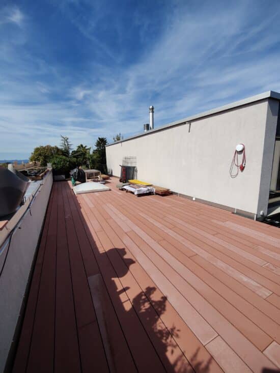 Dach eines Carports, welcher gleichzeitig als Terrasse einer Wohnung dient musste neu eingedeckt werden. Unterkonstruktion in Allu komplett neu und Deck in Bangkirei.
